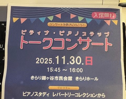 2025年11月30日(日)15:45開演 会場:きらり鎌ヶ谷会館 きらりホール プログラム バッハ 小プレリ
