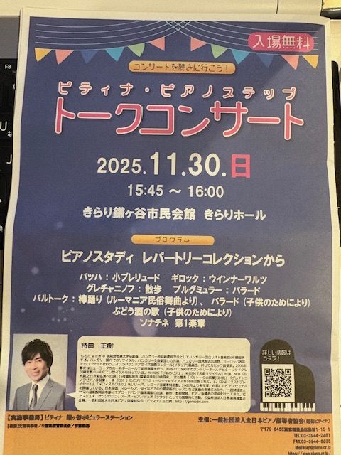 11月30日(日)持田正樹ピティナピアノステップトークコンサート@きらり鎌ヶ谷市民会館 きらりホール 2025年11月30日(日)15:45開演 会場:きらり鎌ヶ谷会館 きらりホール プログラム バッハ 小プレリュード ギロック ウインナーワルツ グレチャニノフ 散歩 ブルグミュラー バラード バルトーク 棒踊り、バラード、ぶどう酒の歌、ソナチネ第1楽章(バグパイプ)